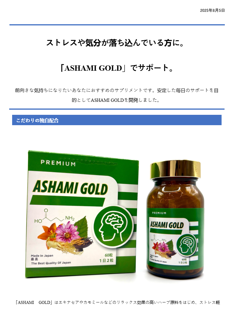 ストレスや気分が落ち込んでいる方に。 「ASHAMI GOLD」でサポート。