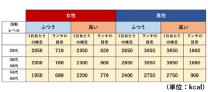 日に必要なカロリーは、性別や年齢、体格や身体活動レベルで異なります。
